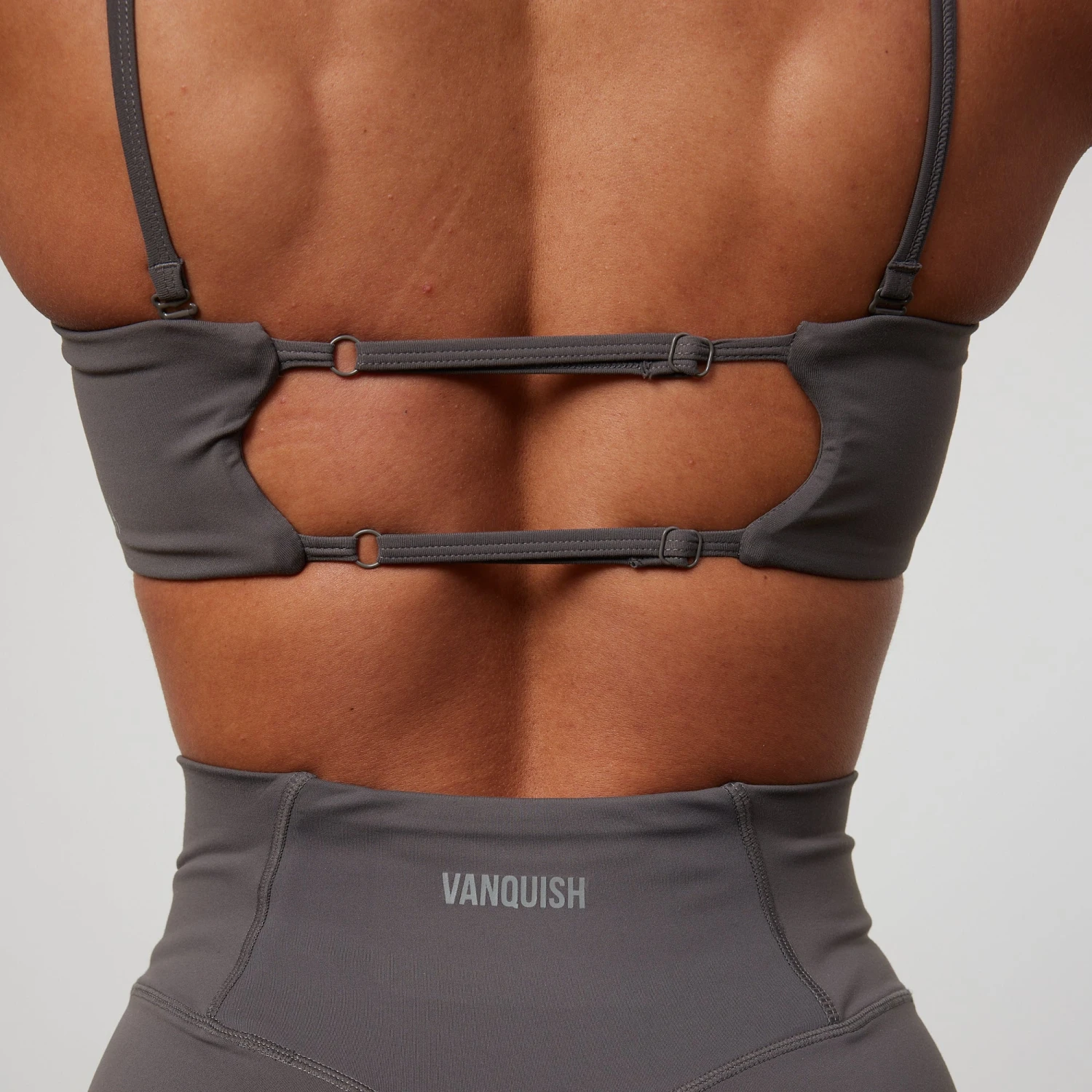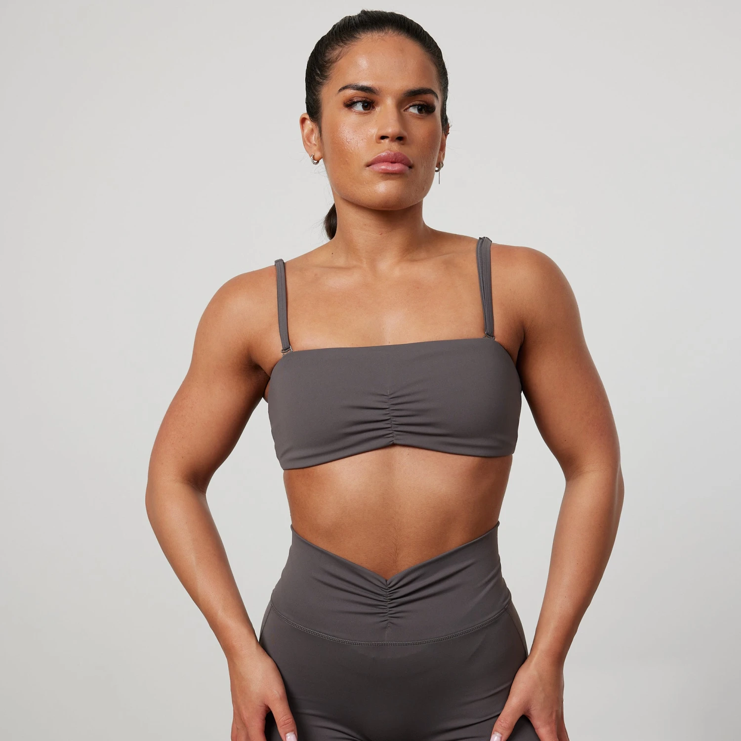 This bandeau bra features adjustable d ring shoulder straps that can be worn in many ways or removed completely. Also featuring double layer front with removable padding, adjustable straps across the back and cross over straps with adjustable ring and slider. Featuring a small, printed logo at the left side.