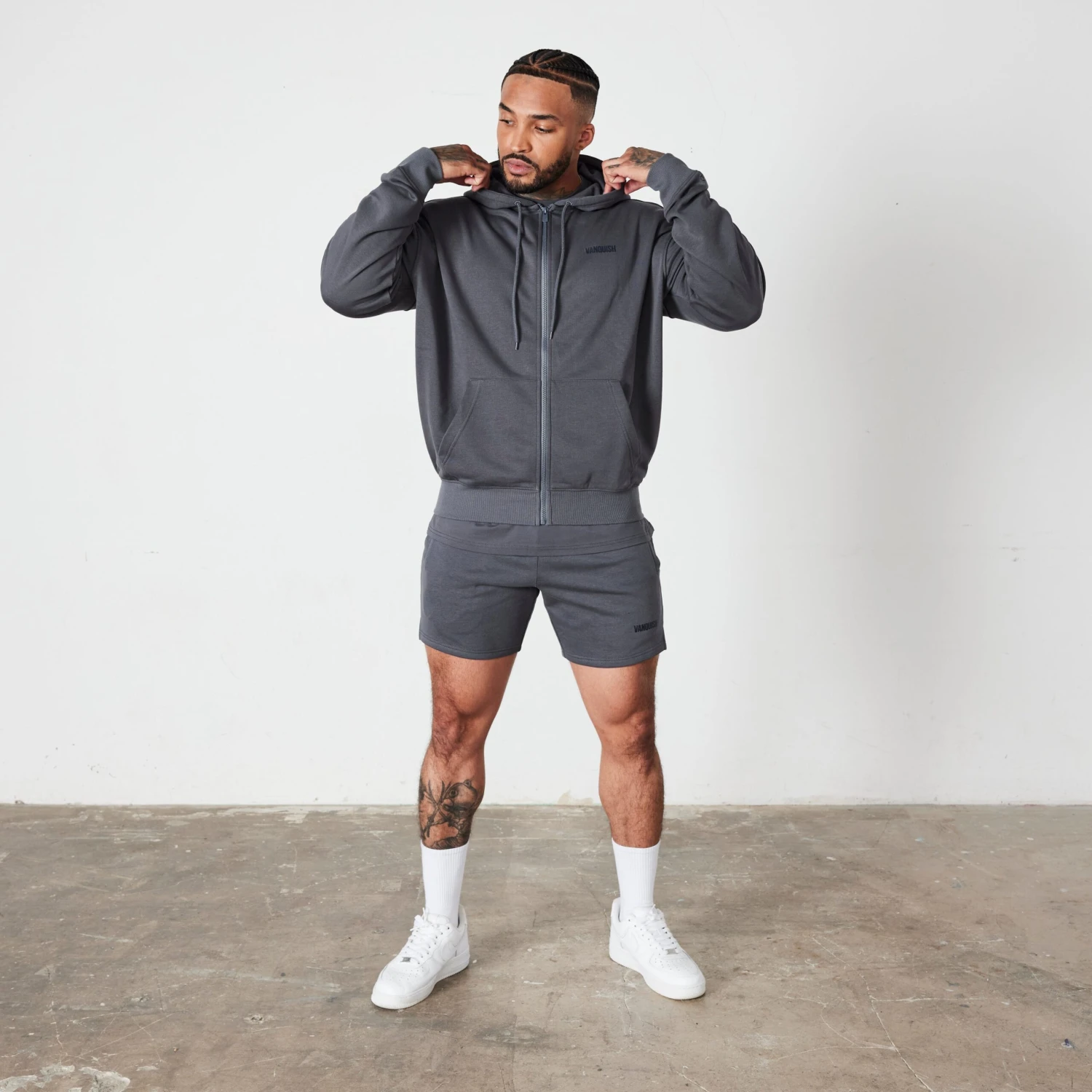 These regular fit shorts feature hand warmer side pockets and a patch pocket on the back. Made in a soft loopback fleece, these shorts feature dyed to match draw cords with a minimal Vanquish logo on the left leg and smaller VQ logo on the reverse.