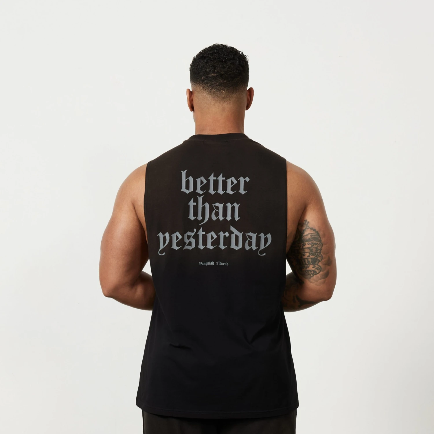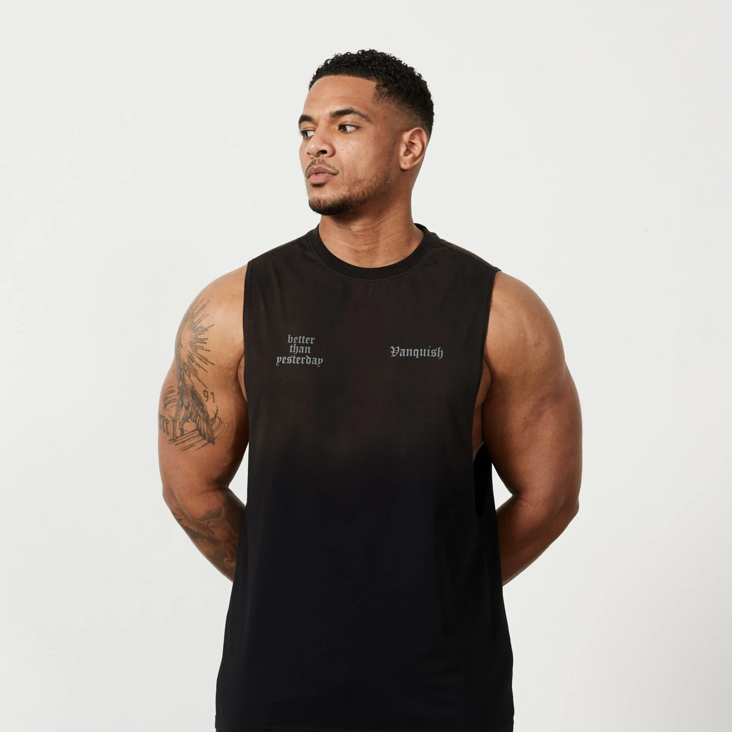This sleeveless t-shirt is made from a soft cotton blend fabric with a deep ribbed collar, straight hem and forward shoulder seam. The back features a bold graphic style of branding with more minimal branding on the front.Â