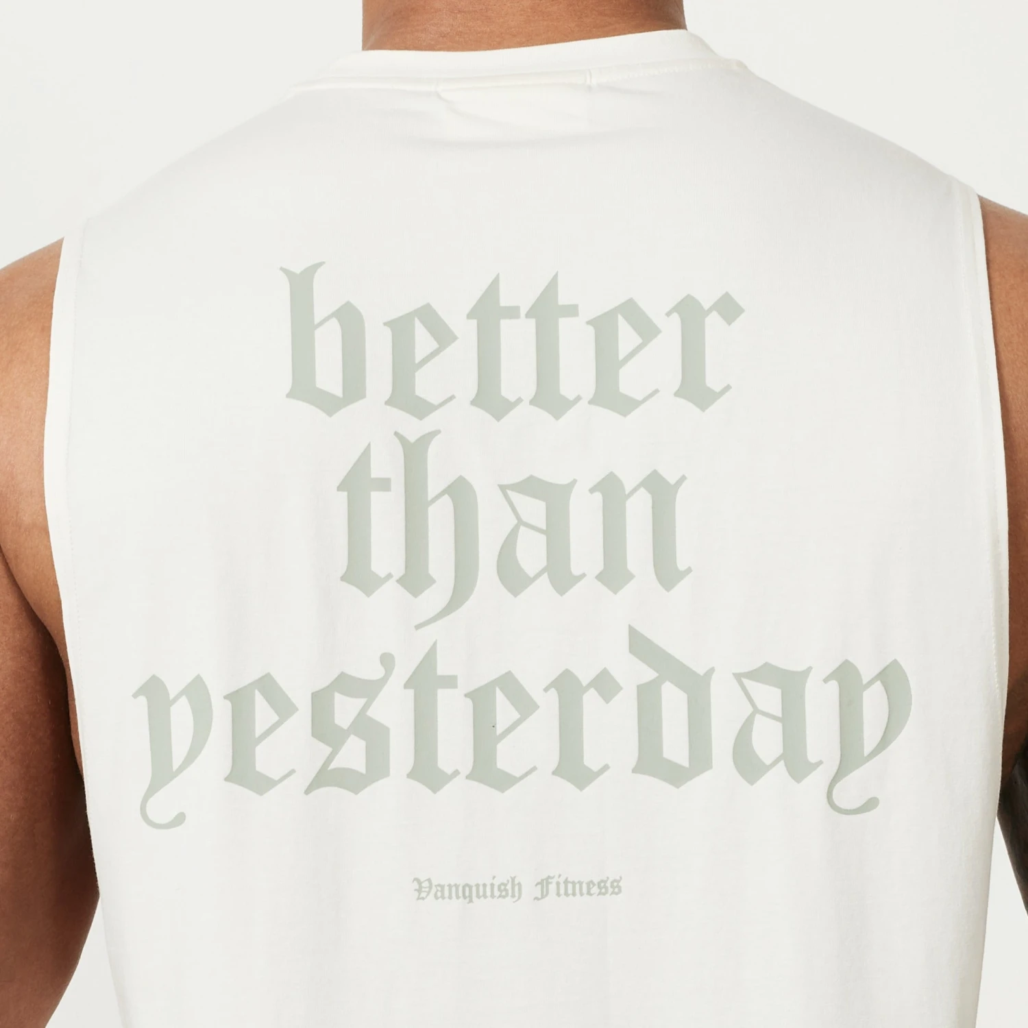 This sleeveless t-shirt is made from a soft cotton blend fabric with a deep ribbed collar, straight hem and forward shoulder seam. The back features a bold graphic style of branding with more minimal branding on the front.Â